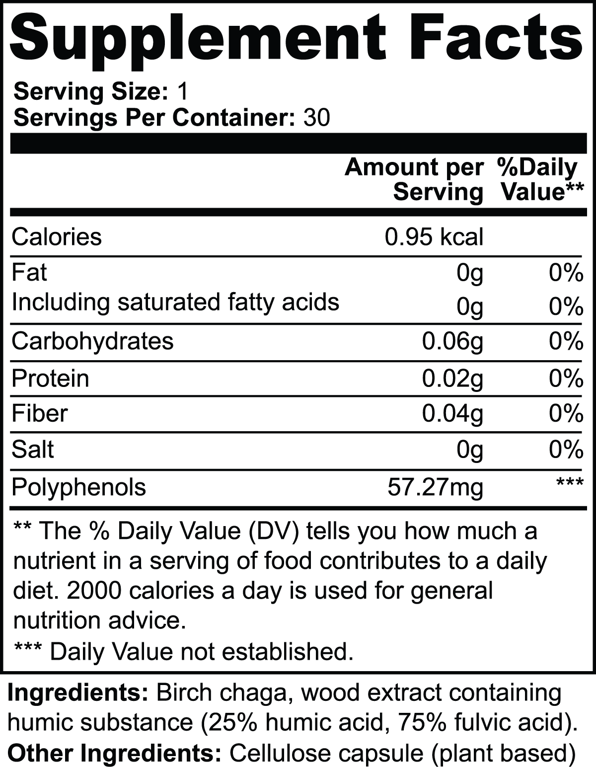 Ingredients: Birch Chaga, Wood extract containing humic substance (25% humic acid, 75% fulvic acid), Cellulose Capsule (plant-based).